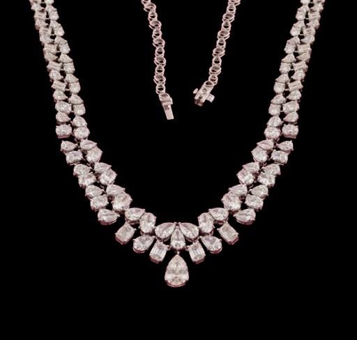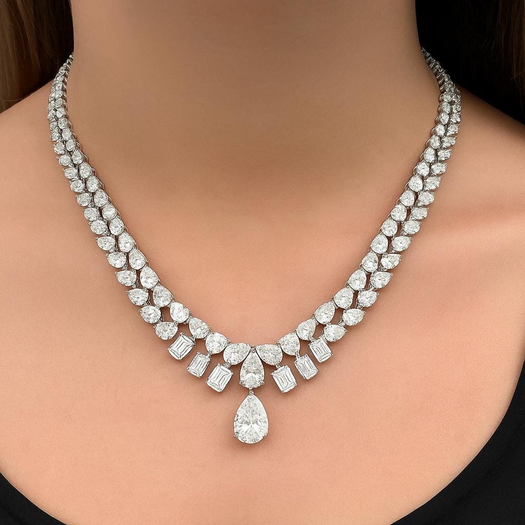 Elevate your bridal elegance with this 20.07 Ct Real SI/H Multi Shape Diamond Wedding Necklace, a masterpiece of fine craftsmanship and timeless luxury. Expertly handcrafted in 18K solid white gold, this exquisite necklace features a dazzling array of natural diamonds in multiple shapes — including round, pear, emerald, and oval cuts — meticulously set to create a stunning visual symphony of sparkle and sophistication.