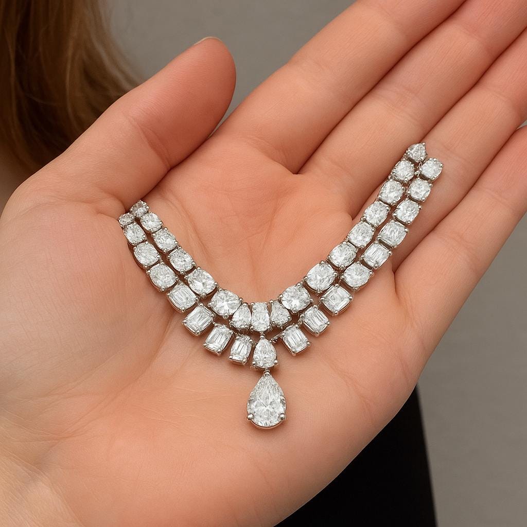 Designed for modern brides and fine jewelry lovers, this statement diamond necklace is ideal for weddings, anniversaries, red-carpet events, or luxury celebrations. It embodies timeless glamor and graceful femininity — a treasure to be cherished for generations.