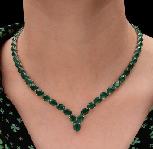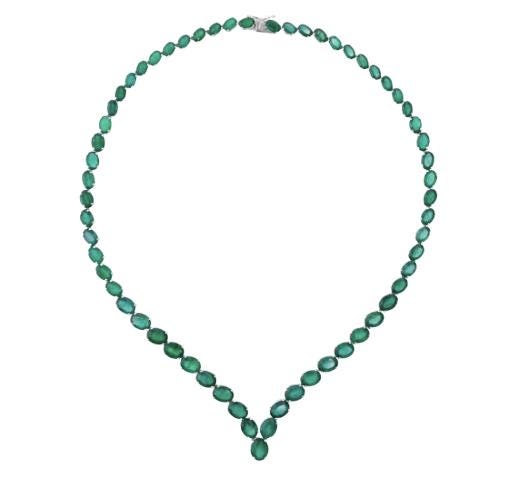 Each emerald is securely set in a polished white gold frame, emphasizing its natural hue while adding a luminous contrast that enhances its vivid green tone. The smooth gradation of gemstones forms a refined V-shape design that elegantly contours the neckline — a true statement of elegance and class.