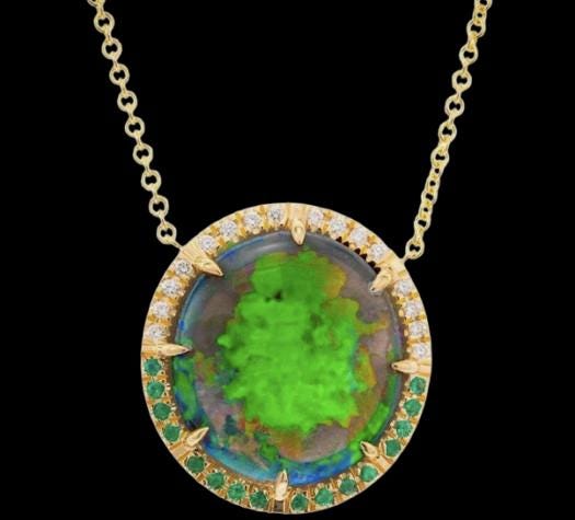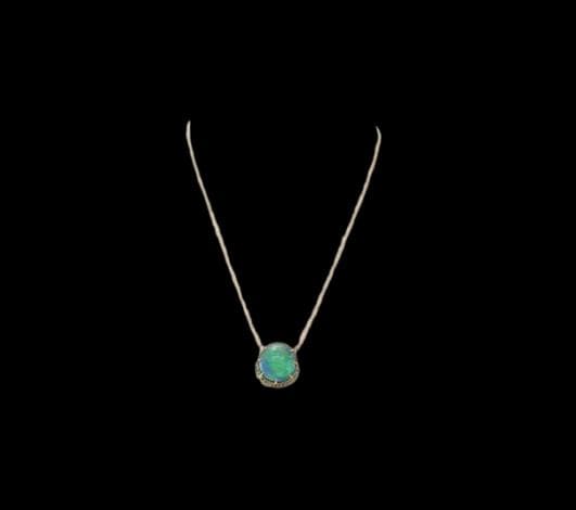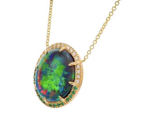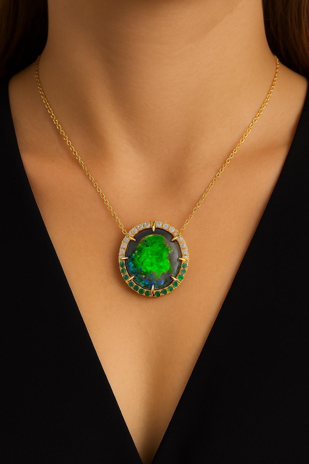 Experience the rare beauty and timeless charm of this Certified 13.62-carat natural opal pendant, elegantly paired with sparkling natural diamonds and set in luxurious yellow gold. This exquisite piece showcases the opal’s vibrant play-of-color—flashes of green, orange, blue, and gold dance across the gemstone, making every angle breathtaking.