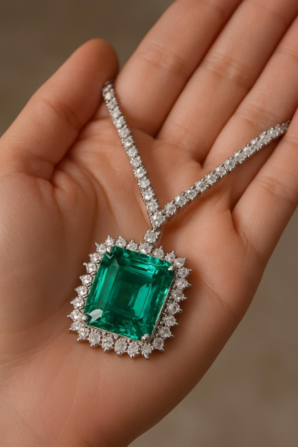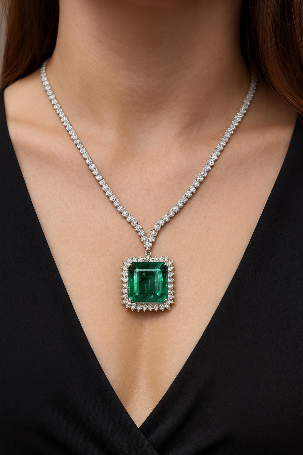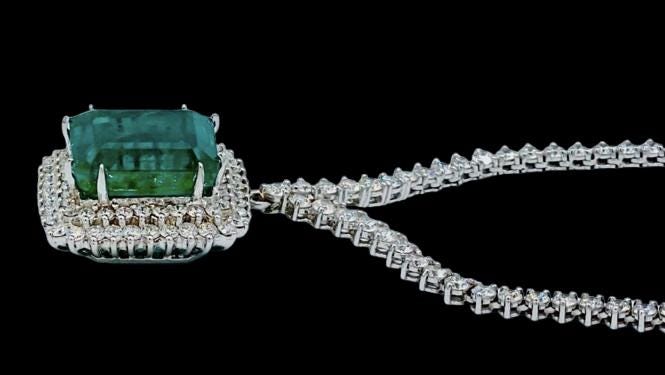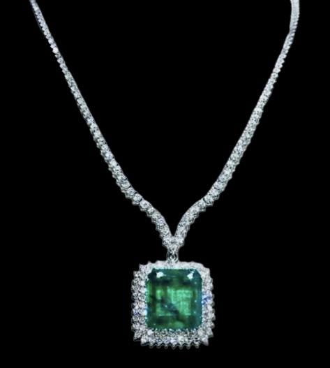 Surrounding the center emerald is a halo of fiery natural diamonds, enhancing its brilliance and adding luxurious sparkle from every angle. The necklace itself is set with shimmering diamonds, completing the piece with elegance and sophistication worthy of a collector's treasure.