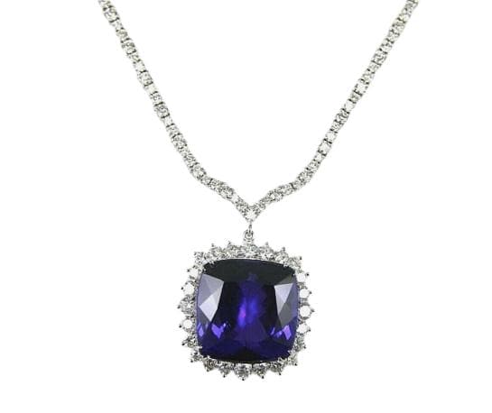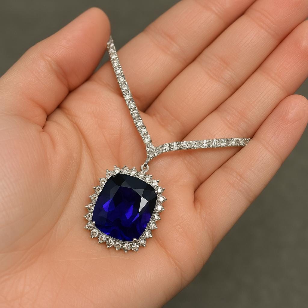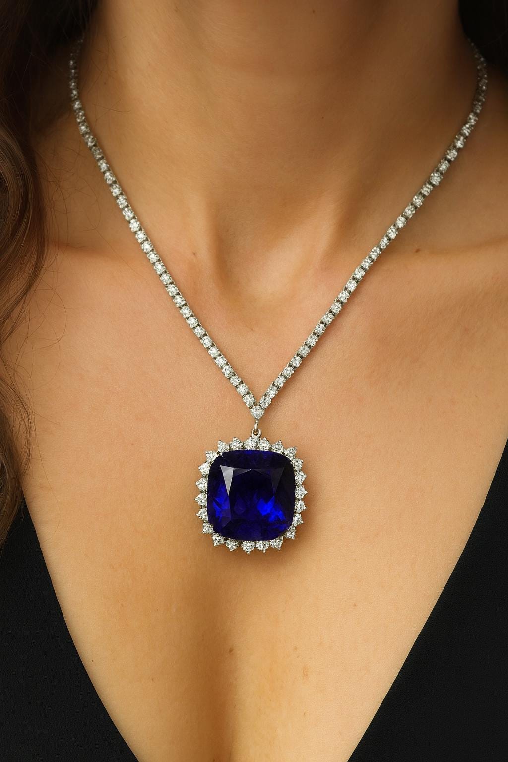 Discover the elegance of true luxury with this breathtaking 91.10-carat Tanzanite & Diamond Tennis Necklace Pendant, handcrafted in premium 18K white gold. The centerpiece is an exceptionally large, richly saturated natural tanzanite—glowing with deep violet-blue tones and remarkable brilliance. Its bold color and impressive size make it a rare collector's gemstone.