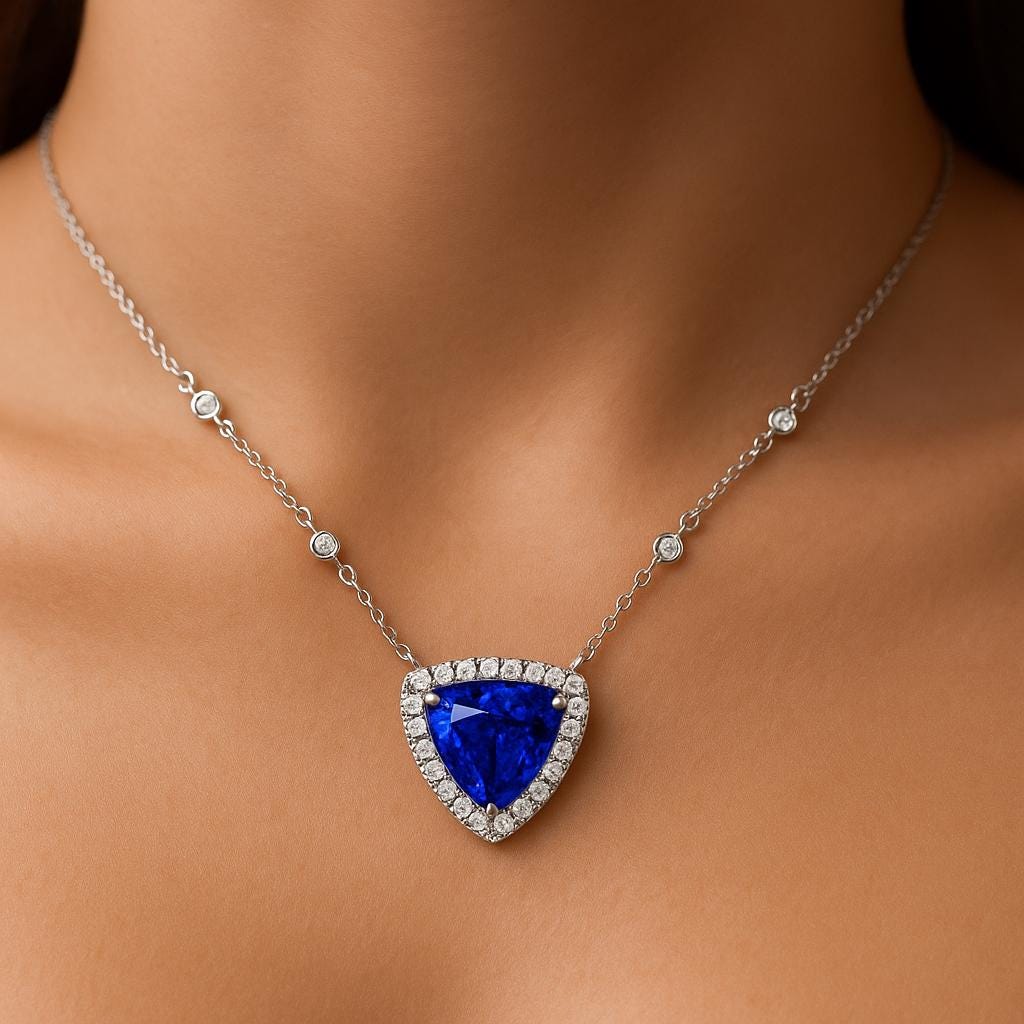 Encircled by a halo of brilliant natural diamonds, the tanzanite radiates elegance and sophistication. The diamonds continue along the chain or accent setting (based on your design), creating a seamless flow of sparkle and luxury. Every detail of this necklace is meticulously crafted by hand, ensuring a flawless finish worthy of high-end fine jewelry.