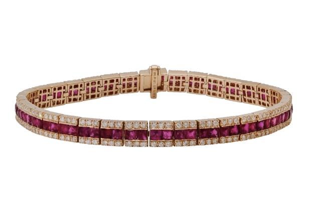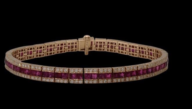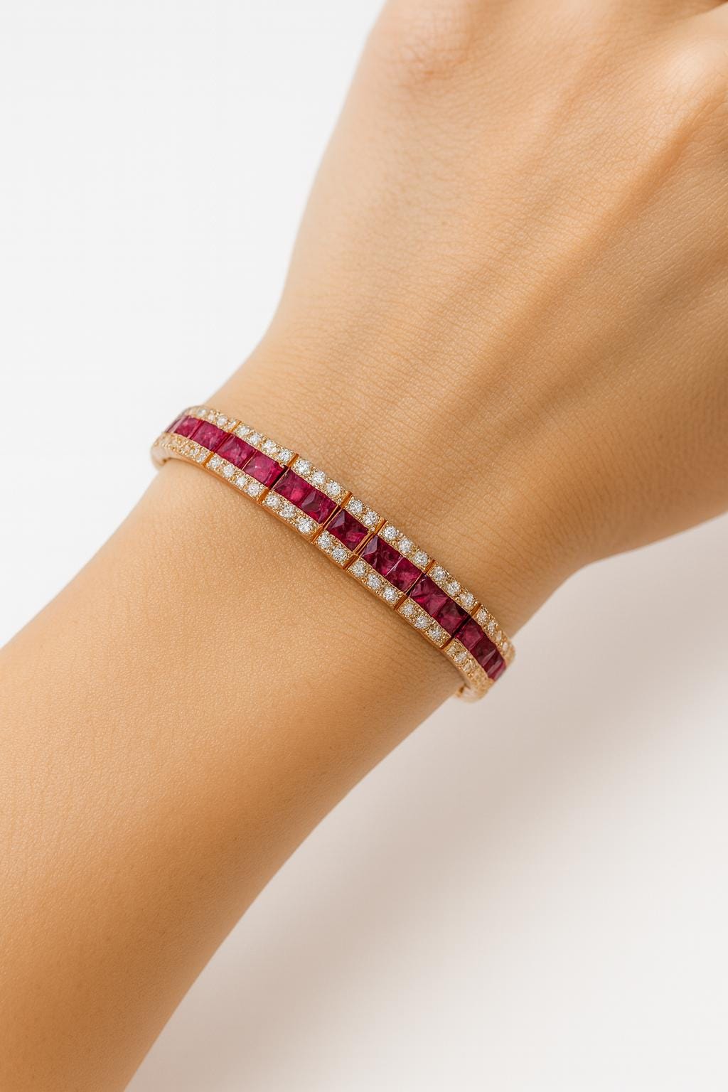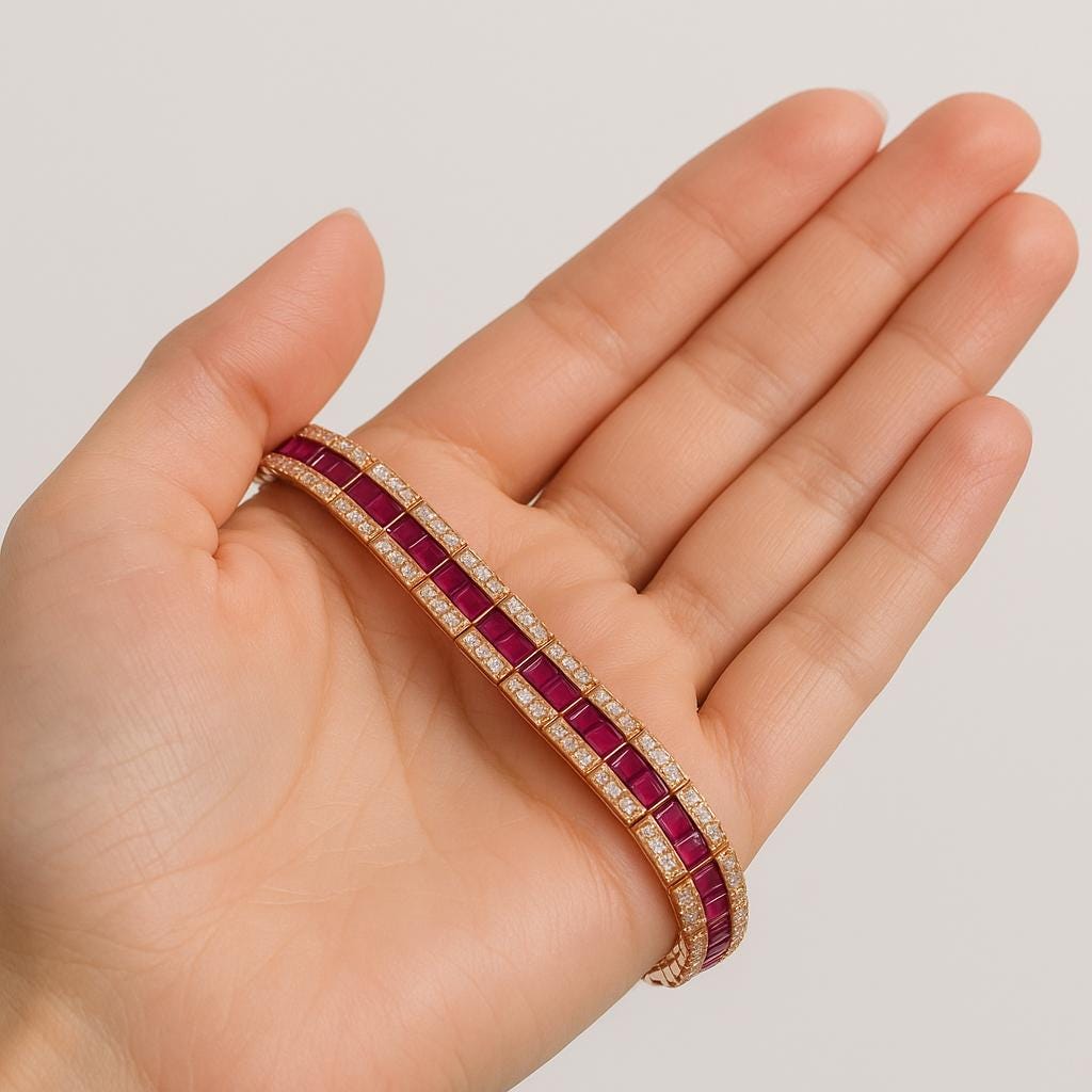 This bracelet features richly saturated natural rubies paired with sparkling white diamonds, creating a striking Art Deco geometric pattern. The warm tone of 18K yellow gold enhances the depth of the rubies, giving the bracelet a bold, sophisticated, and elegant aesthetic. Handcrafted with exceptional precision, this piece is designed for both comfort and longevity.
