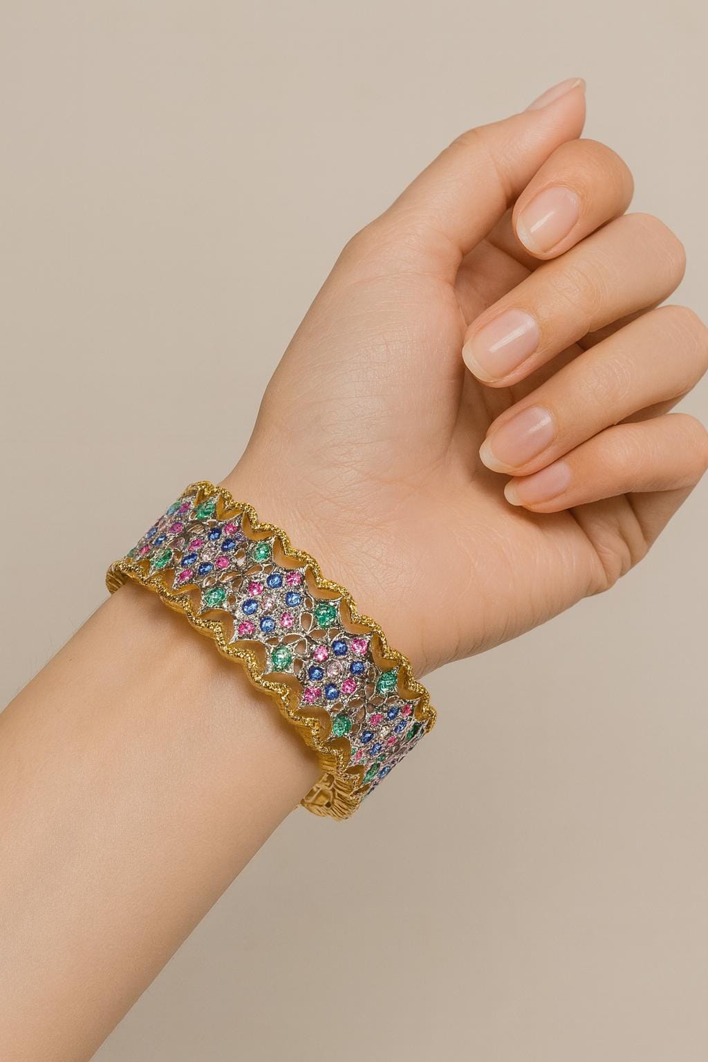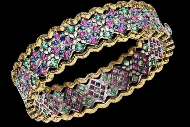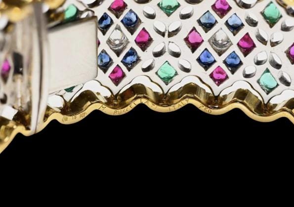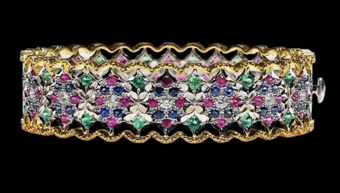 This luxurious bracelet showcases a stunning mosaic of the world’s most precious gemstones— Diamonds for brilliance, Rubies for passion, Sapphires for depth, and Emeralds for elegance.