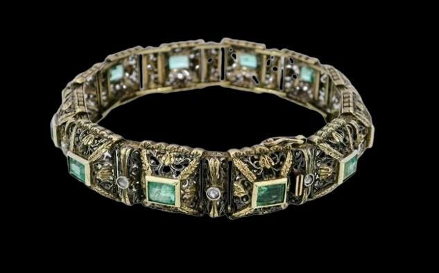 Emeralds are cherished for their vivid green beauty and symbolism of love, prosperity, and harmony. The diamonds add a brilliant contrast, enhancing the luxurious appeal of this handcrafted bracelet.