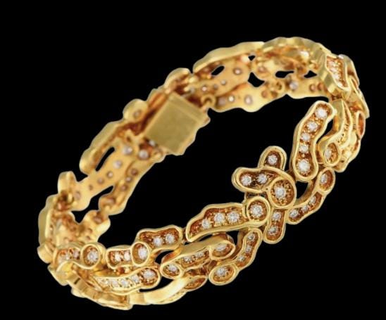 This bracelet blends classic fine jewelry elegance with a bold, elevated aesthetic. The combination of solid 18K gold and over 7 carats of brilliant diamonds makes it a truly rare and unforgettable statement piece.