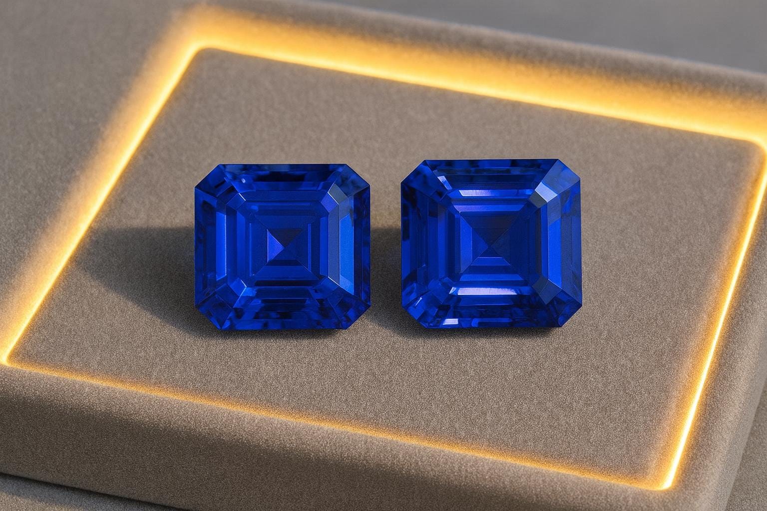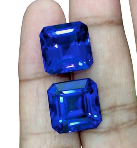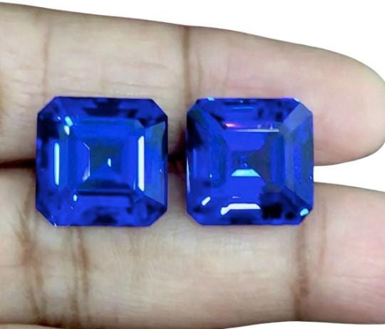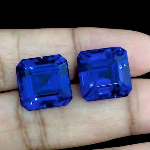 Introducing a stunning 32.50 carat matched Asscher Cut Tanzanite pair, showing the finest purple-blue top color that high-quality Tanzanite is known for. These gemstones display exceptional clarity, vibrant saturation, and expert faceting—making them ideal for luxury jewelry designers, collectors, and bespoke high-end creations.