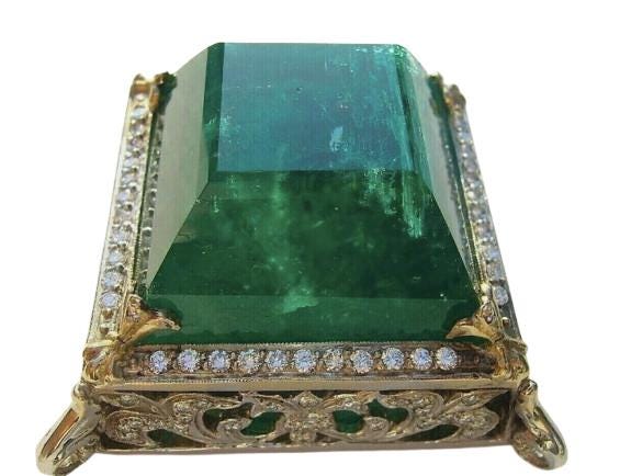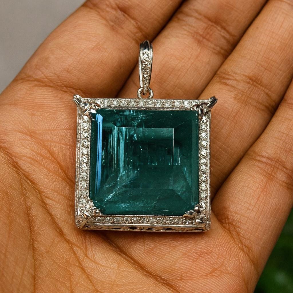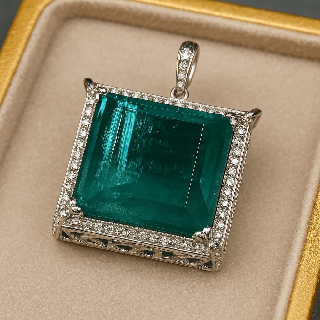 Discover the magnificence of this extraordinary 312.79 carat Natural Emerald Pendant, beautifully set in luxurious 18K White Gold and surrounded by a sparkling 2.30 carat diamond halo. This museum-grade statement piece showcases a rich, vibrant green emerald with exceptional presence, depth, and elegance. The diamond-encrusted frame enhances the emerald’s glow, creating a truly breathtaking heirloom-quality pendant.